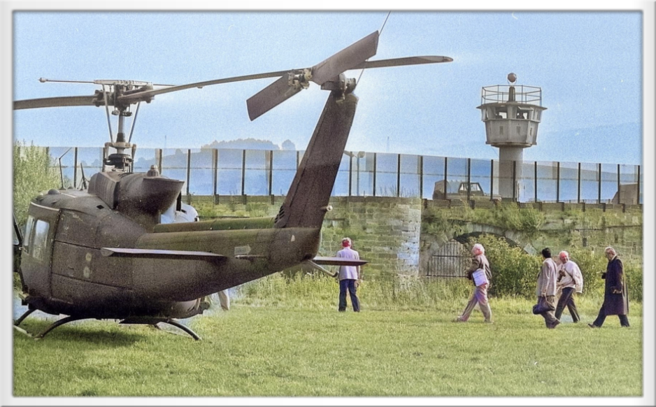 US Hubschrauber vor der Absperrung zwischen Philippsthal und Vacha 1988, rechts auf der Brücke der Beobachtungsturm BT-11